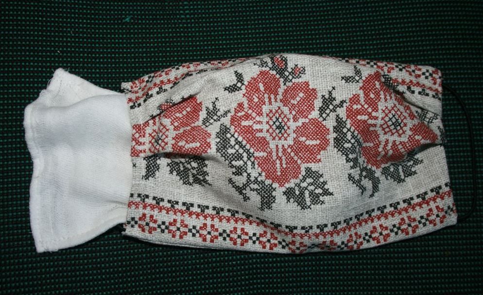 Это не принт: очень похоже, что вышито на домотканом льне в одну ниточку – как раз такой способ вышивки крестиком дает подобный полупрозрачный эффект. Оригинально, конечно, и красиво. Но я считаю, что маску нужно не только проглаживать утюгом, но еще и периодически обеззараживать в чем-то хлорсодержащем. Конечно, вышивка такого обращения не переживет. Поэтому, эта маска скорее для пиара ))